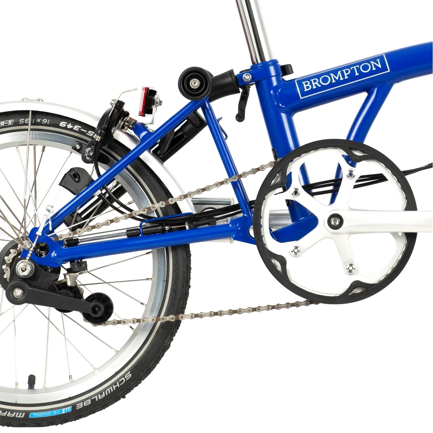 - Hubs: (F) Brompton front hub (R) Brompton Wide ratio 3 speed internal gear hub with 2 speed external gears (13 and 16 tooth)