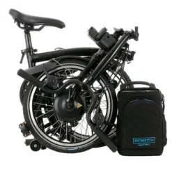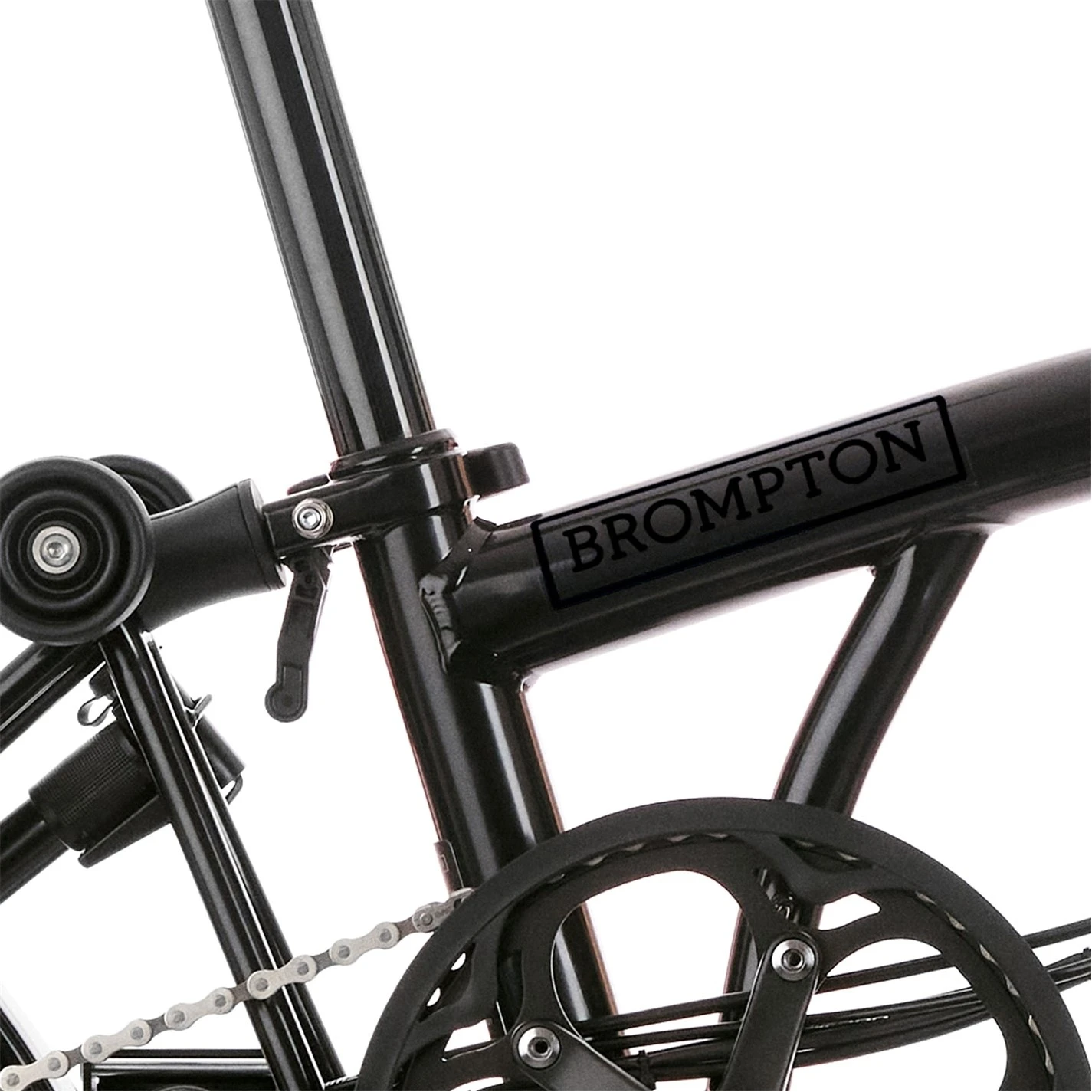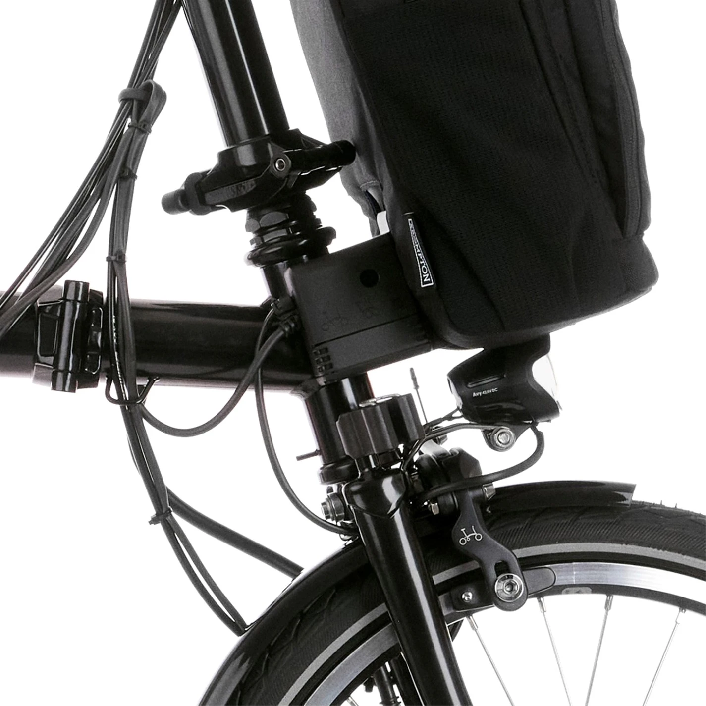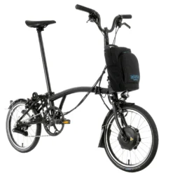 - Saddle: Brompton saddle with integrated carry handle (147mm). Incorporates a mount for a Brompton rear light and saddle bag.