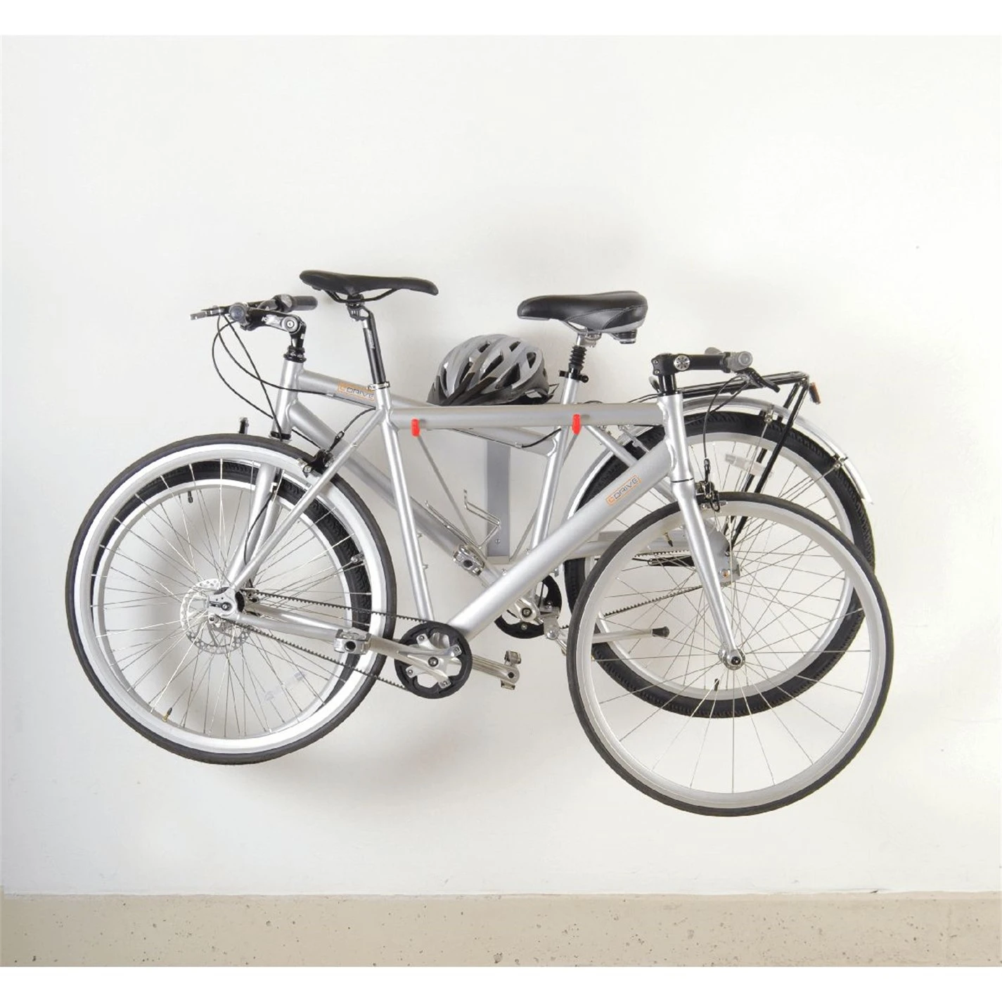 Folding wall mount easily stores 2 bikes. It’s integrated shelf provides space for helmets or other accessories.