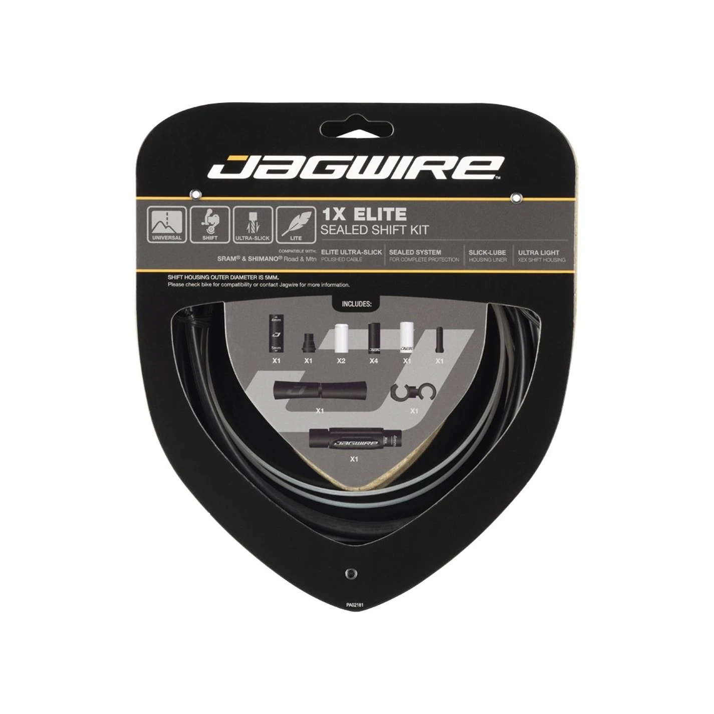 Jagwire Elite Sealed Shift Kits use a continuous liner that seals the system completely, protecting it against dirt, water, and other contamination. Available in three colors and for 1x or 2x drivetrains, this system offers the ultimate combination of protection and low-friction performance. To ensure the best possible performance, we’ve paired Elite Polished Ultra-Slick inner cables with our Slick-Lube continuously-lubricated liners. This combination delivers precise cable movement and excellent durability. The continuous liner running from the levers to the derailleur offers outstanding protection from dirt and debris. Elite Polished Ultra-Slick cables are paired with Slick-Lube liners to minimize friction. Lightweight XEX shift housing is nearly 30 lighter than traditional shift housing. 2x kits are designed for use with both front and rear derailleurs, while 1x kits are for rear derailleur or internally geared hub only.