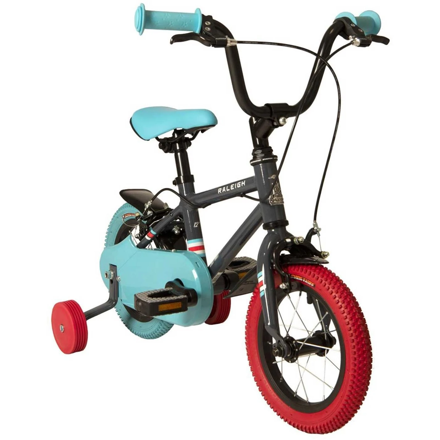 The Raleigh Pop 12 is for kids who have almost mastered their balance but still need a little support. The black frame is offset with colourful stripe details and contrasting tyres in blue and red. Our internal cables minimise the risk of potential incidents and our aluminium brake levers have been designed to be operated by little fingers. We’ve added non-slip pedals, carefully colour matched to the bike design and puncture protection tyres to keep your little one moving!