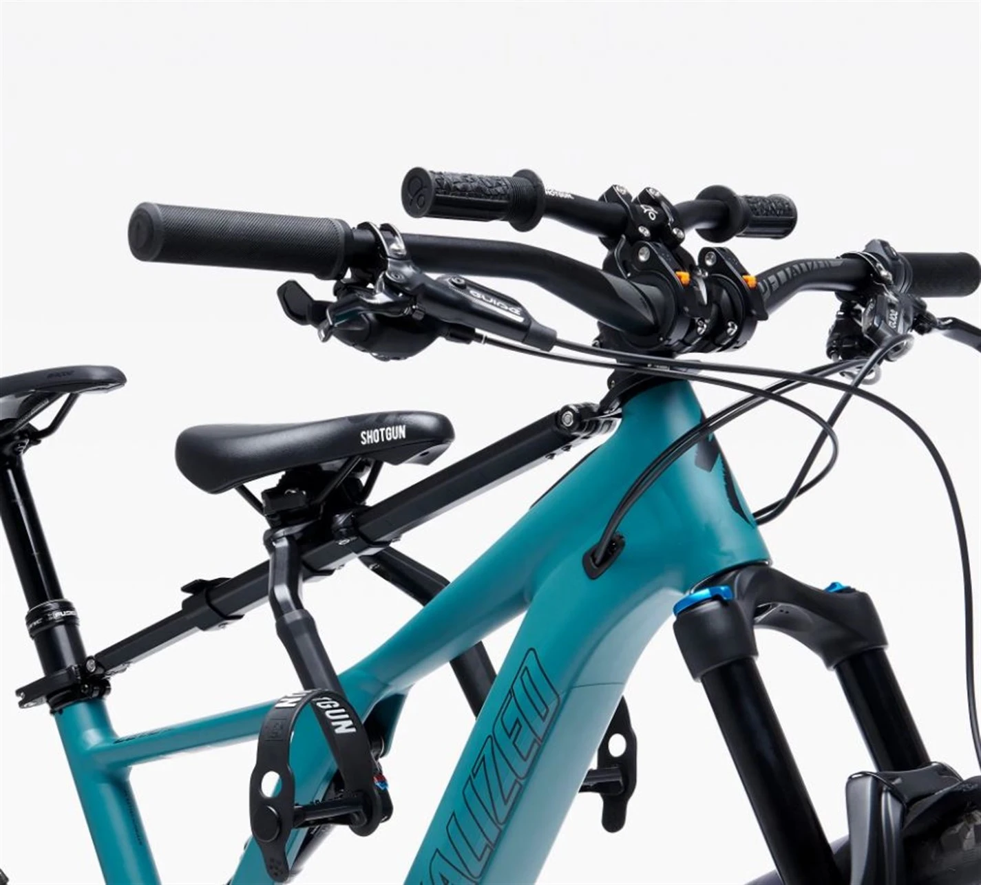 The Kids Ride Shotgun Pro Combo Children’s Bike Seat and Handlebars is the ultimate setup for your mountain bike kid. Lightning fast to attach and remove, zero frame contact and adjustable to fit electric & regular mountain bikes.
