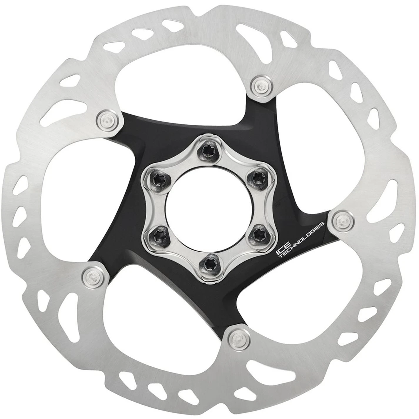 Shimano RT86 XT Ice-Tec 6-Bolt Disc Rotors are made from a stainless steel/alloy 3-layer sandwich construction that manages heat while riding. The clad steel/alloy/steel rotor construction allows heat generated from braking to radiate quickly through the aluminium core achieving surface temperature drops of around 50 deg C. When used with Ice-Tec pads surface temperatures can drop from around 400 to 300 deg C, this provides great improvements in performance all round. Ice-Tec rotors achieve long pad life, less noise and less fade due to improved heat dispersion.