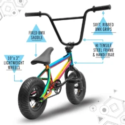 – Authentic Styling: From the 3in wide tyres to the fixed saddle, and the top-load stem to the 25T-9T micro gearing, this mini kids BMX bike is ready to shred!