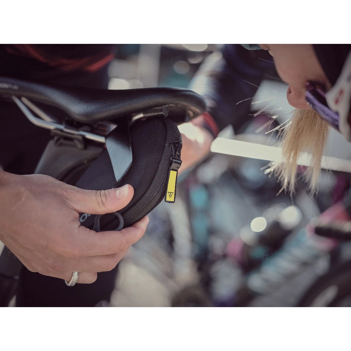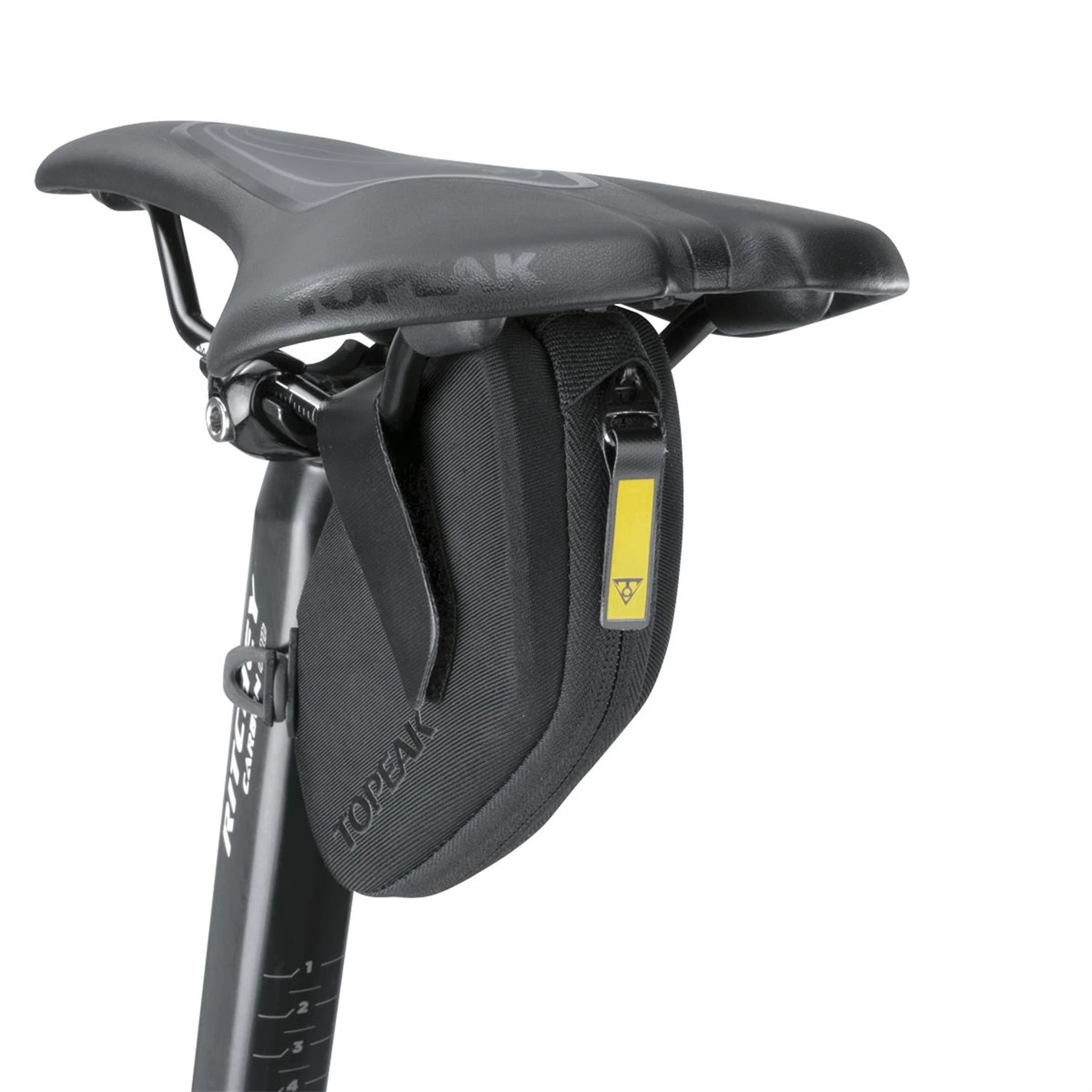 > Elastic Polyurethane Fiber / EVA Foam > 210 Denier / 420 Denier Nylon (weatherproof version) > Easily mount to saddle rails with adhesive straps and seatpost with rubber strap > Suitable for most type of saddle rails > Fits 25.4 – 31.8mm > Micro: 14×4.5×10.5cm, 0.35L, 66g > Small: 18.5x6x14.5cm, 0.8L, 98g > Small Waterproof: 14x5x10.5cm, 0.35L, 45g