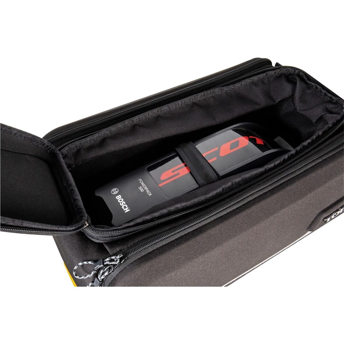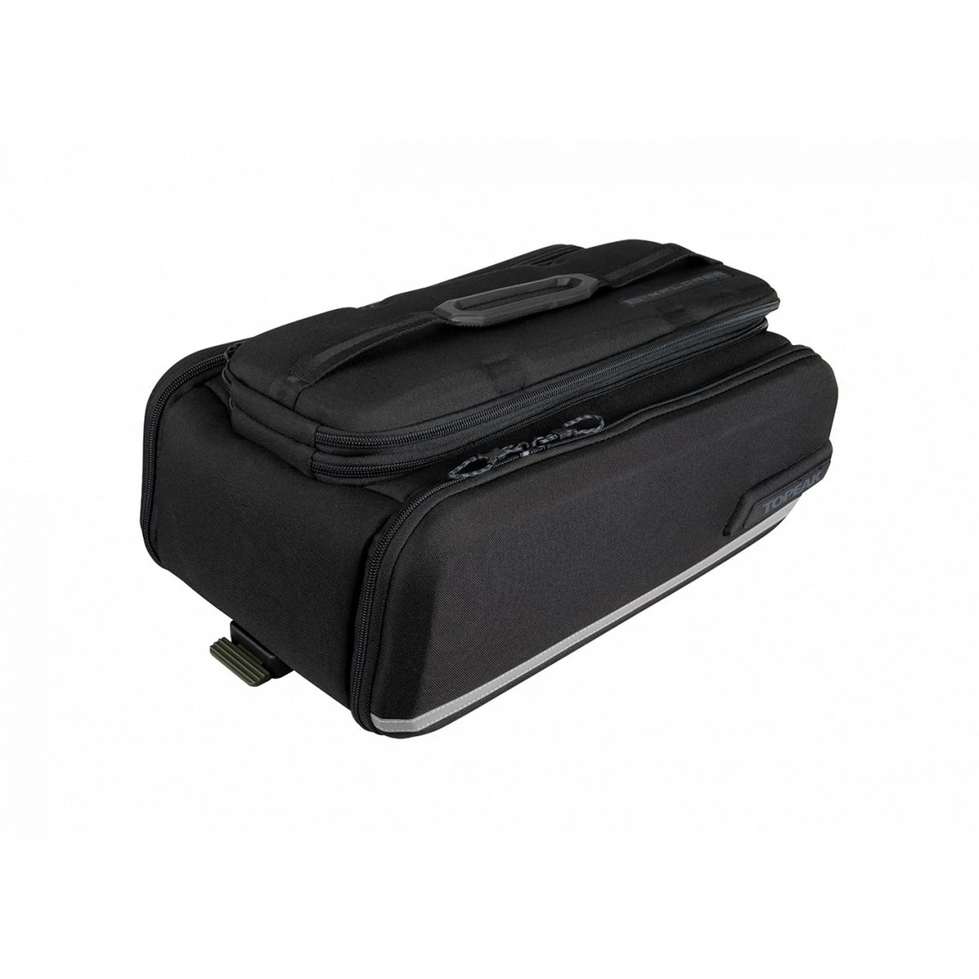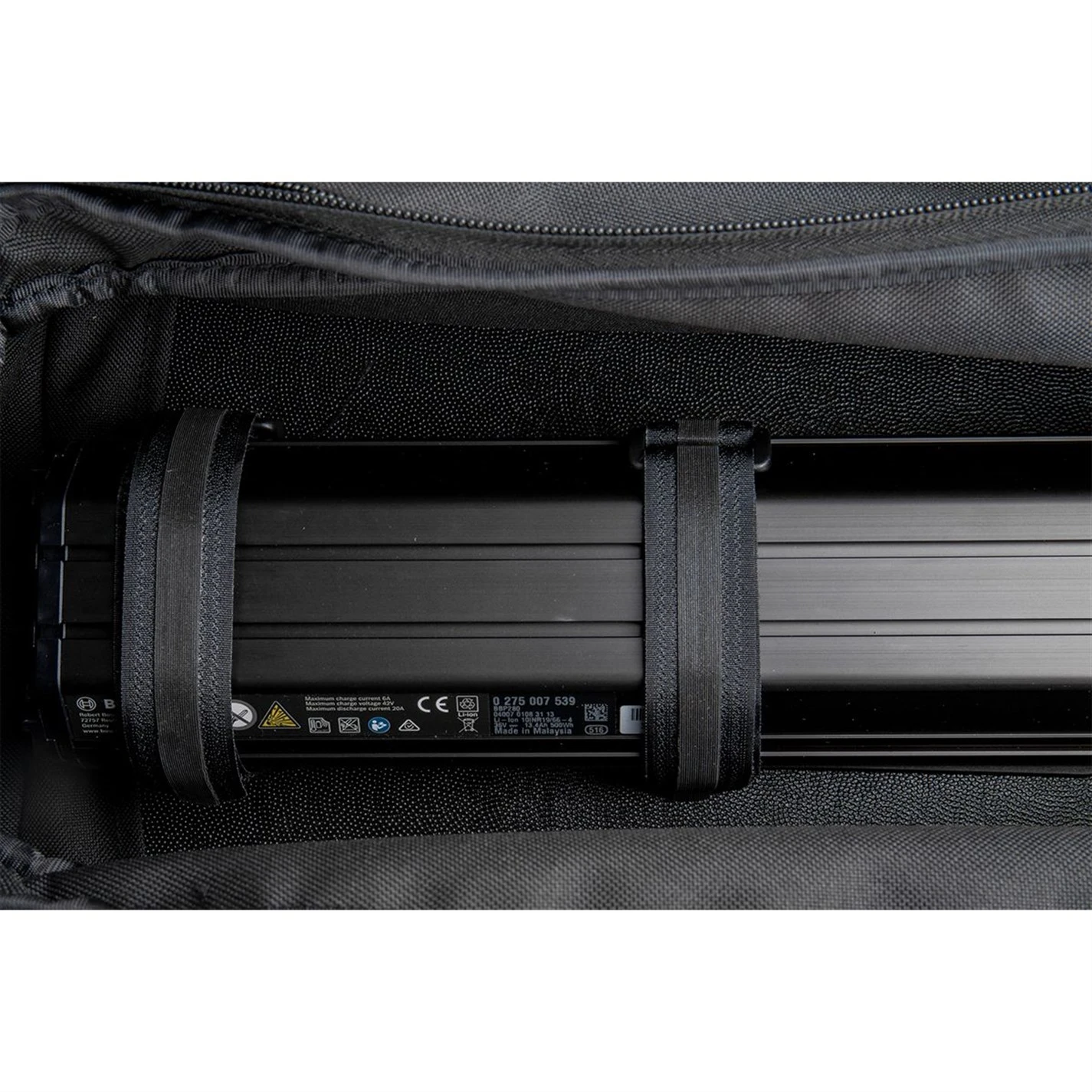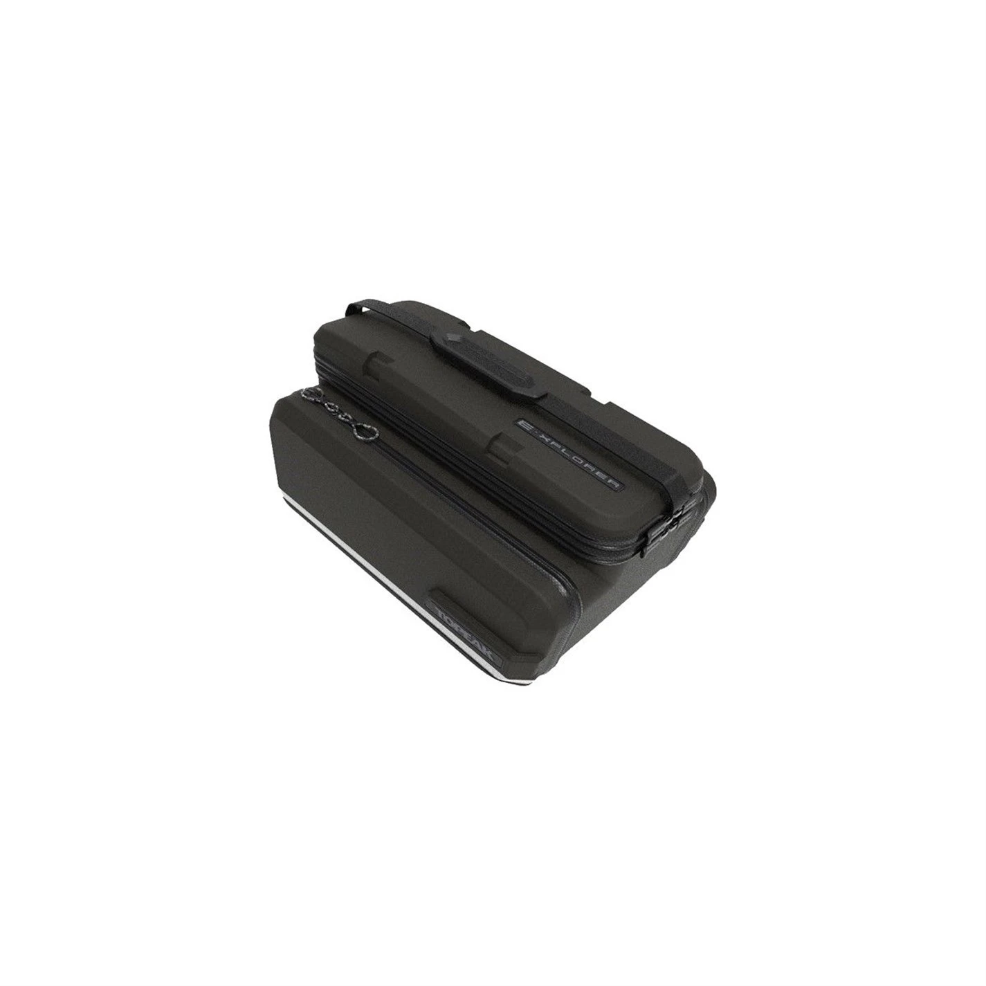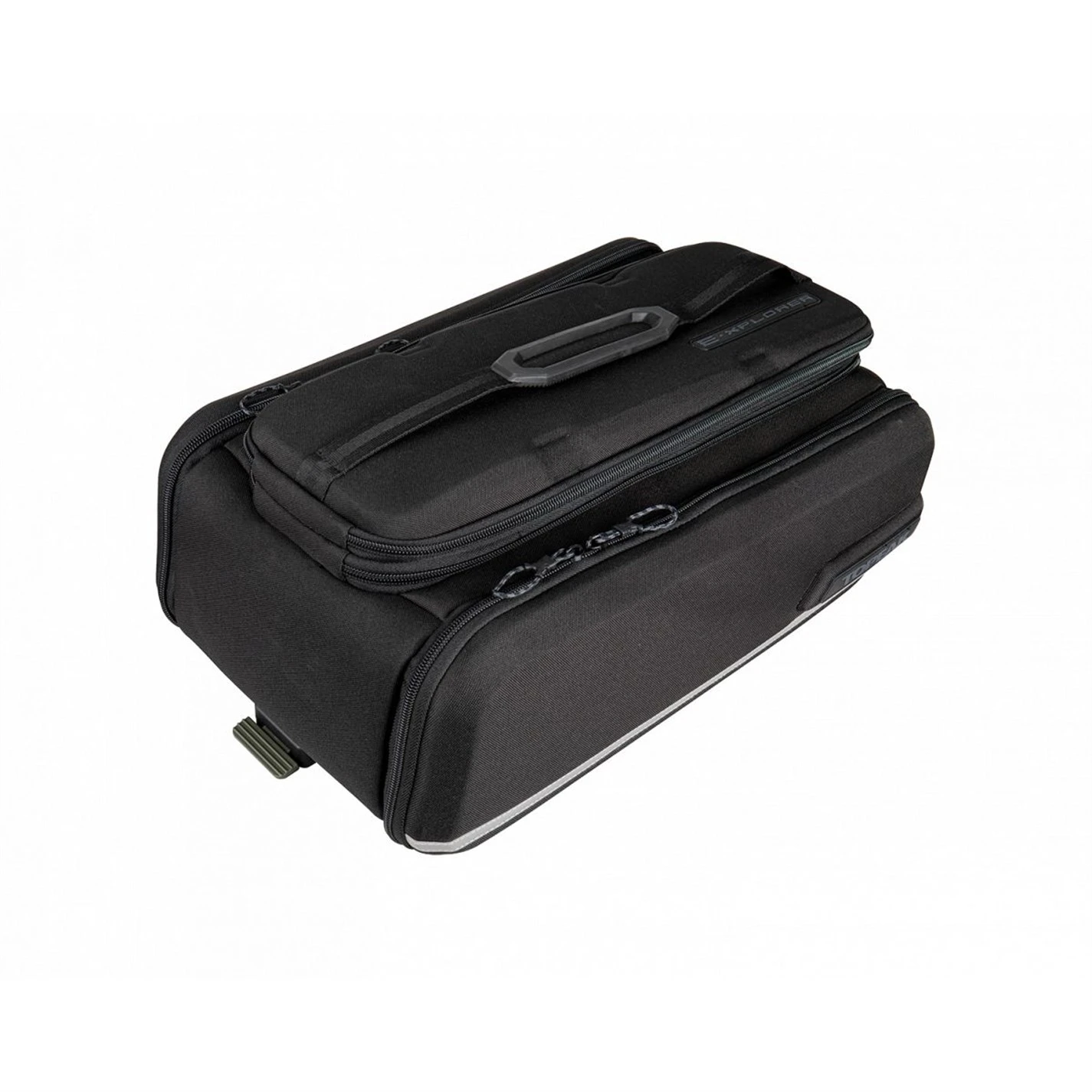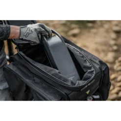 Built to go further! The E-Xplorer TrunkBag is an eBike specific spare battery carrier made of rigid EVA foam and Polyethylene providing structure, excellent impact absorption, and water repellency. In addition to the expandable top section, the side panels expand to full panniers maximizing capacity. The grip straps secure a spare battery in place while 3M(TM) reflective strips and attachable rear light MOLLEcompatible strap add extra safety. Compatible with Topeak’s MTX QuickTrack 2.0 racks, there’s even enough room to carry additional gear for your eMTB adventures!