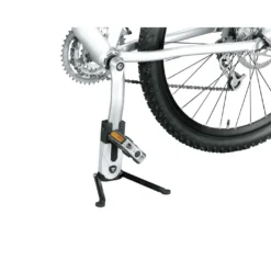 Ultra compact folding stand for storing or displaying mountain bikes on hard, level surfaces. Works with non-drive side crank arms and folds down small enough to fit in a jersey pocket