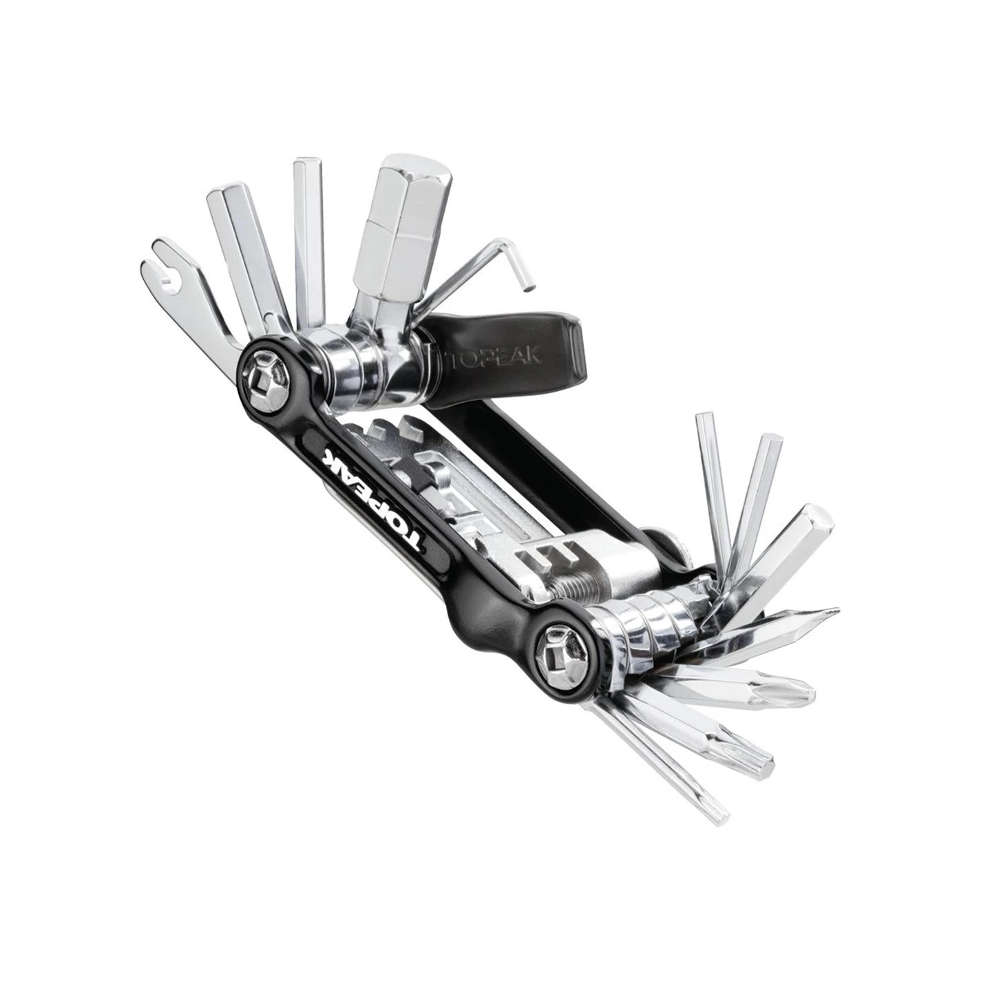 > 2-L, 2.5, 3 (2 pcs), 4, 5, 6, 8, 10mm Allen wrenches > T10, T25 Torx > 2 Phillips, Flat head screw drivers > 14G, 15G, Mavic M7, Shimano spoke wrenches > CrMo steel chain tool with chain pin breaker > Stainless steel wire chain hook > Super hard-anodised tyre lever > Bottle opener with spoke holder > Chrome vanadium steel tools > Forged aluminium tool body > 151g (Mini 20 Pro tool) > 55g (ToolBox)