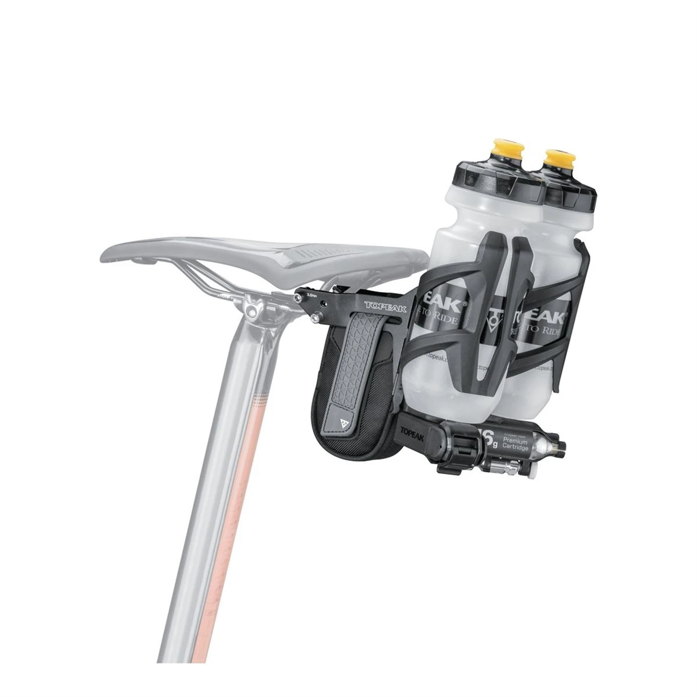 This highly versatile, lightweight mount allows you to carry bottles, tools, tyres, tubes, CO2 inflators and more. Ideal for long training hours in the saddle or when your flat out in a race. Available in 2 versions to mount on conventional saddles or triathlon saddles with vertical rails.